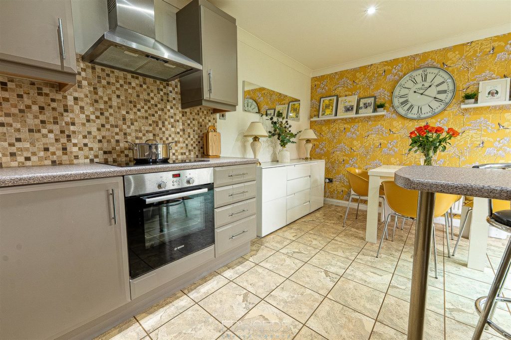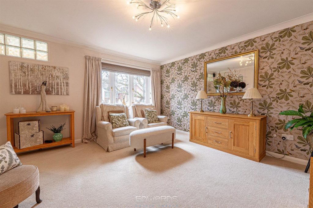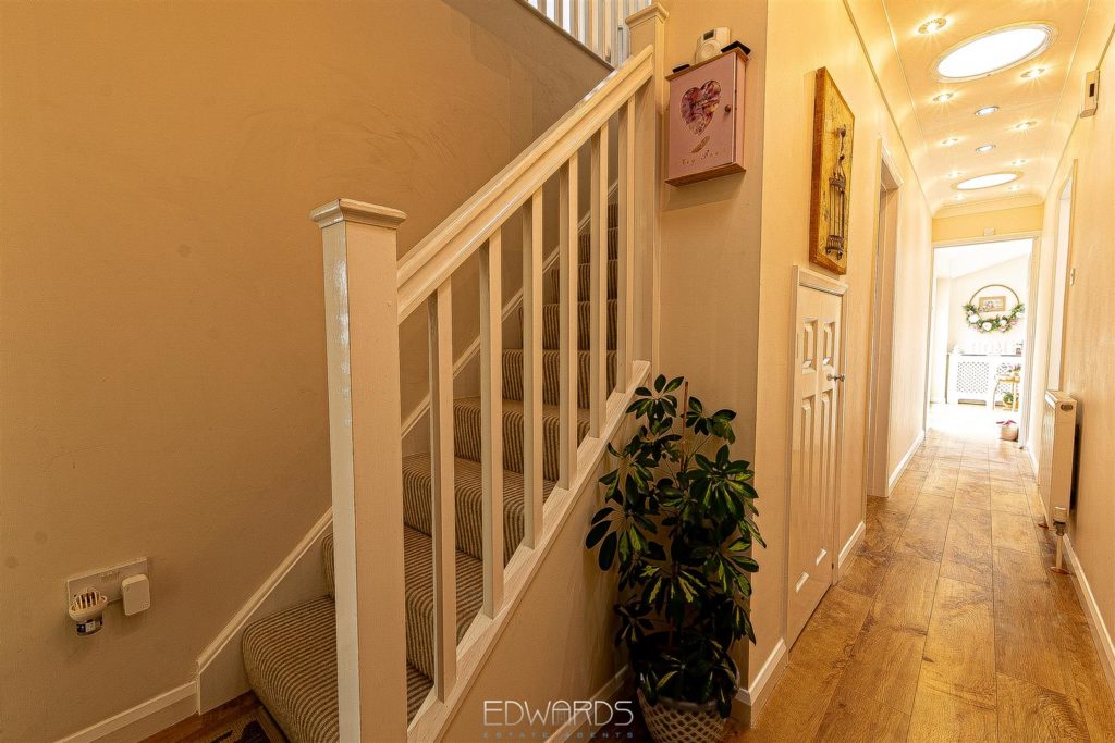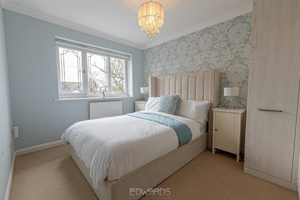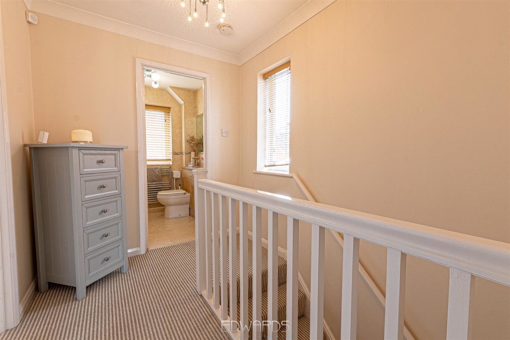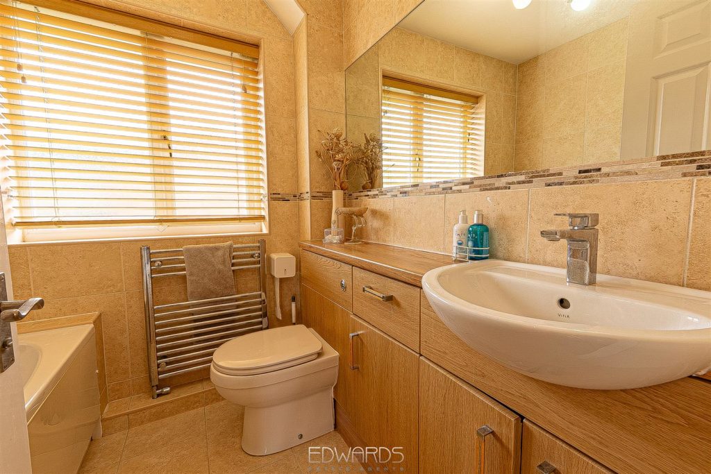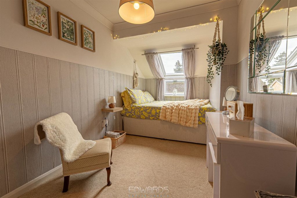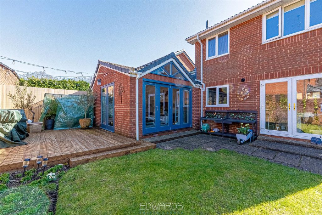 The enchanting garden room, with its dual aspect and bi-fold doors, opens onto a generous decked platform, creating an inviting space for alfresco dining and entertaining. The first floor comprises three further bedrooms, all served by a fully tiled family bathroom equipped with a bath, vanity wash hand basin, and semi-concealed WC.