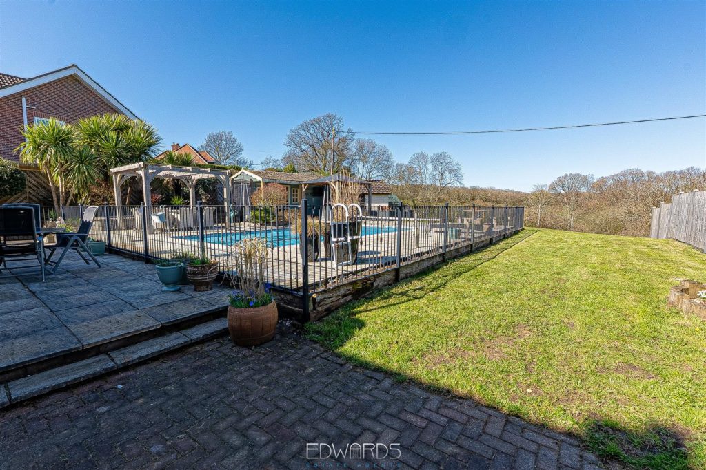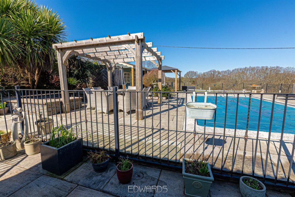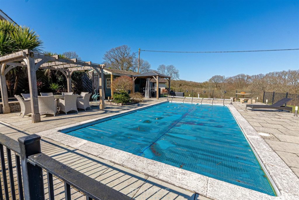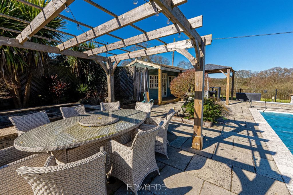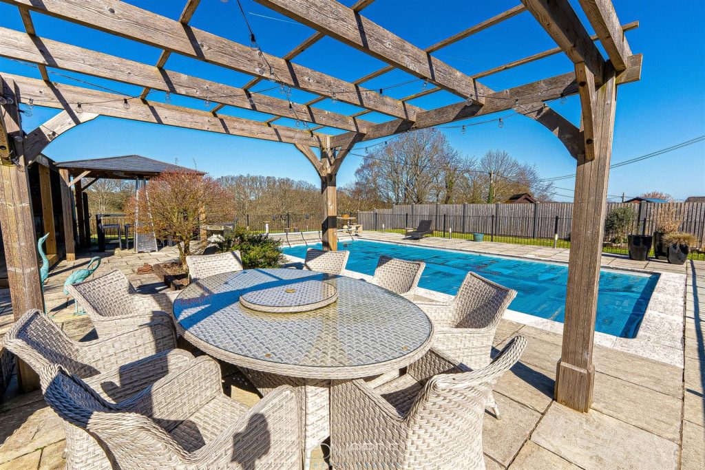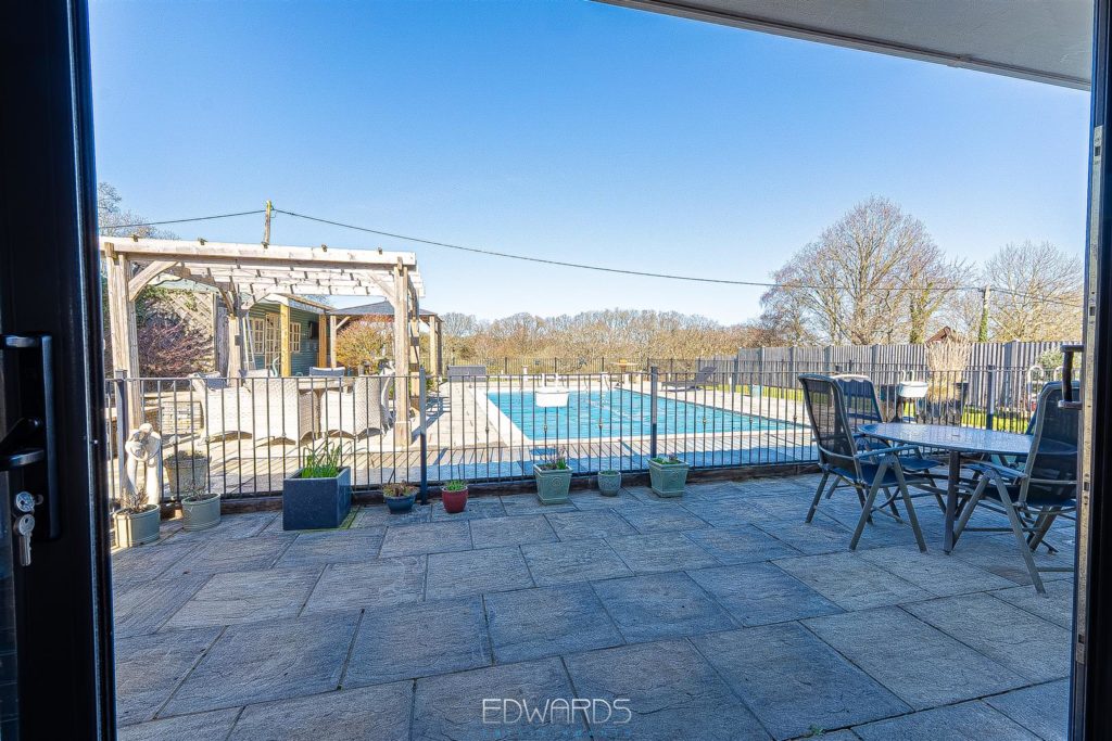 Outside there is a garage and “enclosed” car port. A paved terrace spans the rear of the property and overlooks the heated swimming pool with pool house and pergola and the adjoining paddock beyond.