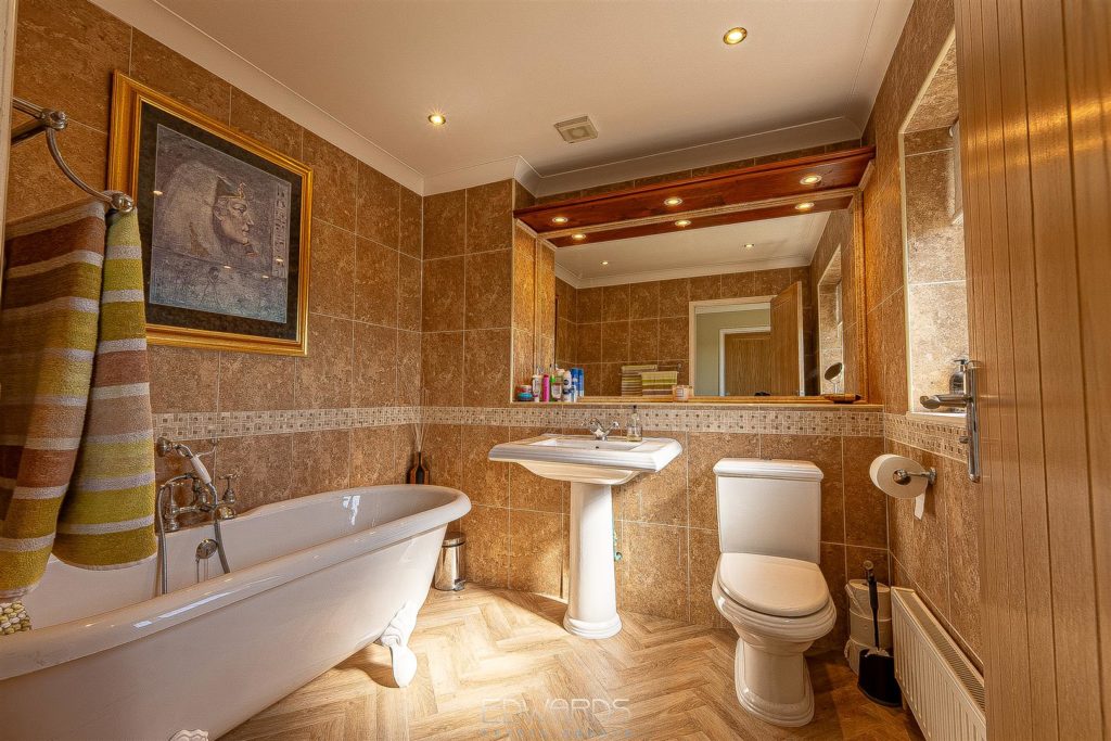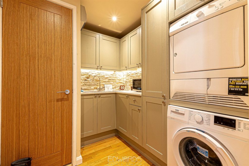 The hub of this stunning residence is undoubtedly the “L” shaped kitchen/family room spanning the rear elevation with two sets of sliding glazed doors opening to the paved terrace which overlooks the heated swimming pool. The stylishly appointed kitchen is finished to a high specification throughout with a range of integrated appliances and a generous array of high quality base and wall units, as well as a substantial island unit with inset sink and further storage. Off the hallway, a separate utility room is equally well equipped with units, sink and space for washing machine and dryer and there is also a ground floor shower room.