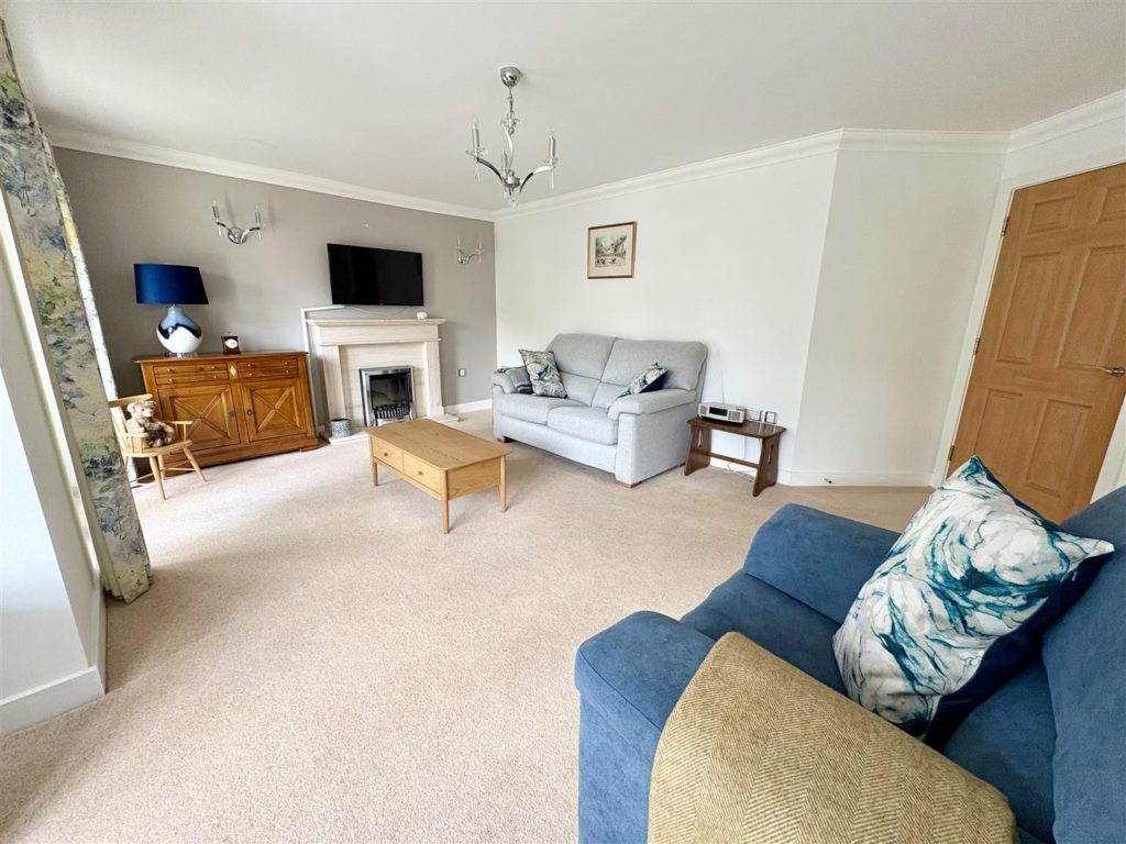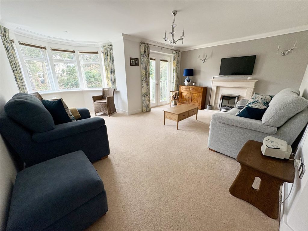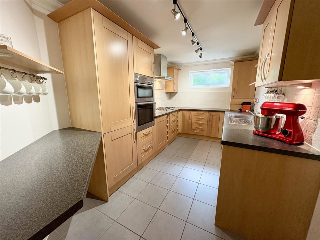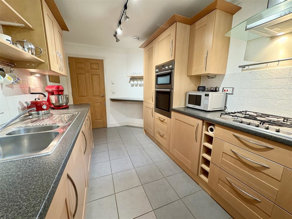 The modern kitchen, equipped with high-quality Neff appliances, including a built-in double oven, fridge/freezer, dishwasher, washing machine, and a gas hob. The bright and airy lounge/diner has double doors opening onto a private balcony, providing delightful views over the surrounding area.