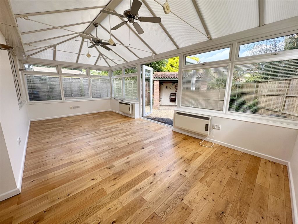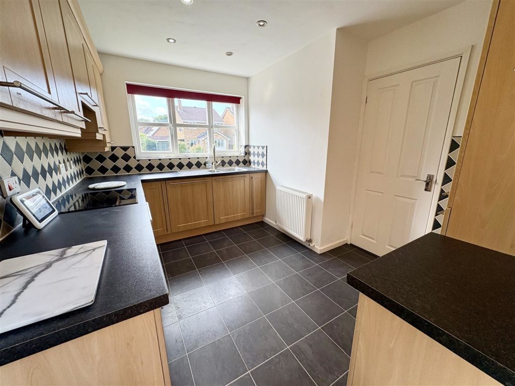 Upon entering, you are greeted by a welcoming hallway featuring oak effect flooring and an understairs storage cupboard. The ground floor includes a convenient cloakroom/utility, a generous formal living room with a remote control living flame gas fire, and a well-proportioned dining room that flows seamlessly into the conservatory. The kitchen is fully fitted with modern wooden fronted units, integrated appliances, and dual aspect windows that fill the space with natural light.