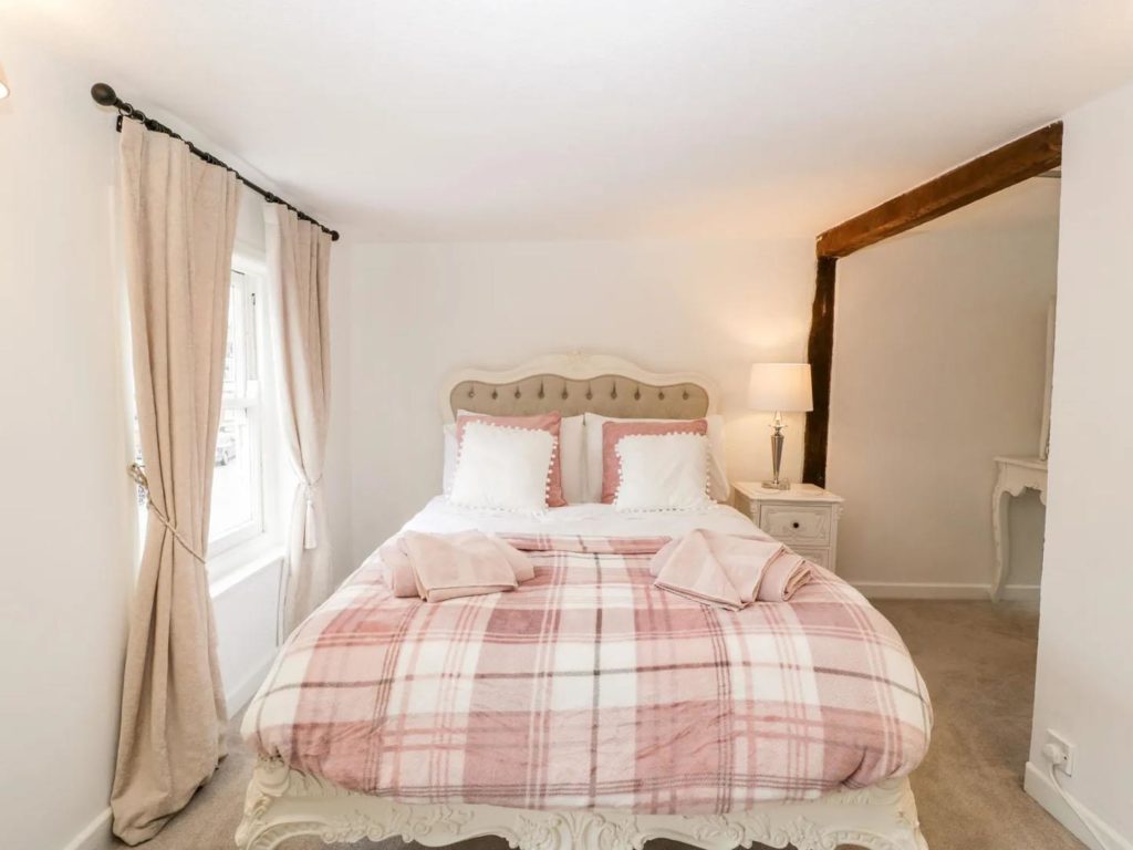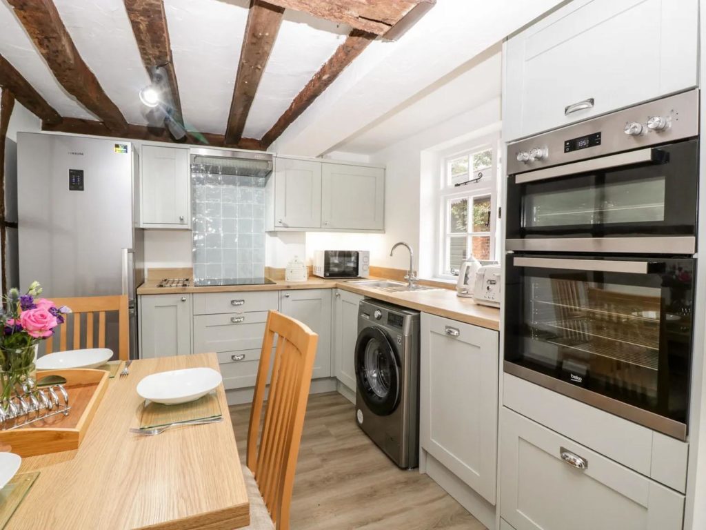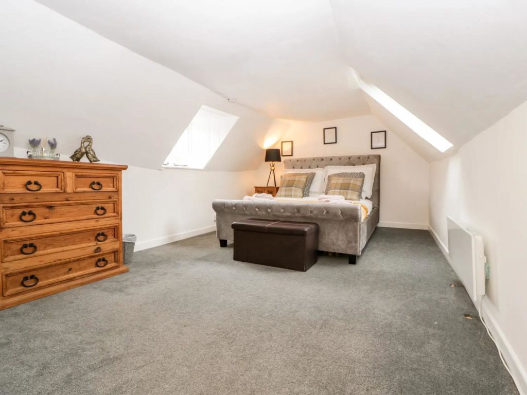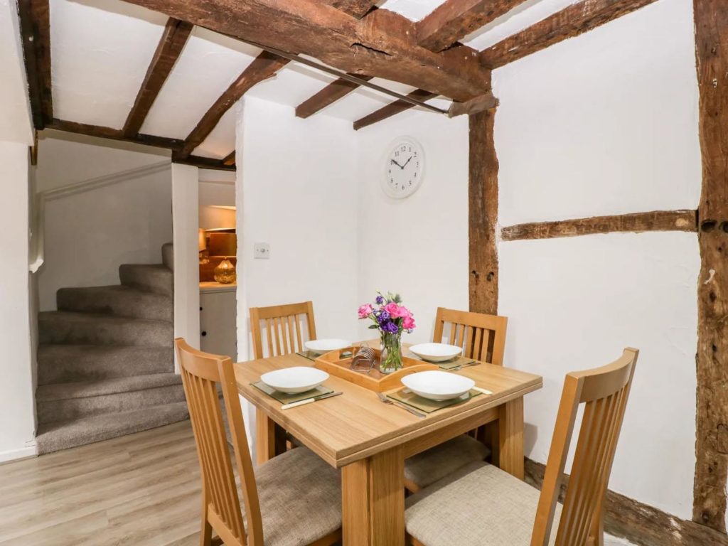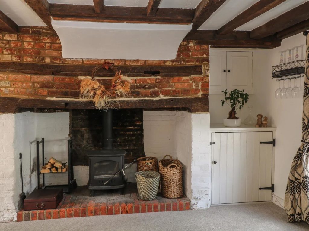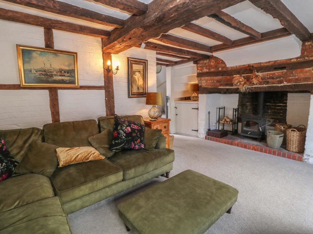 On the ground floor there is a modern kitchen overlooking the rear courtyard. With room for table and chairs, there is a larder cupboard next to the stairs and open access through to the cosy sitting room with a woodburner in the feature inglenook fireplace. The dual aspect master bedroom occupies the first floor, along with a bathroom which includes a shower over the bath. A further double bedroom is at second floor level.
