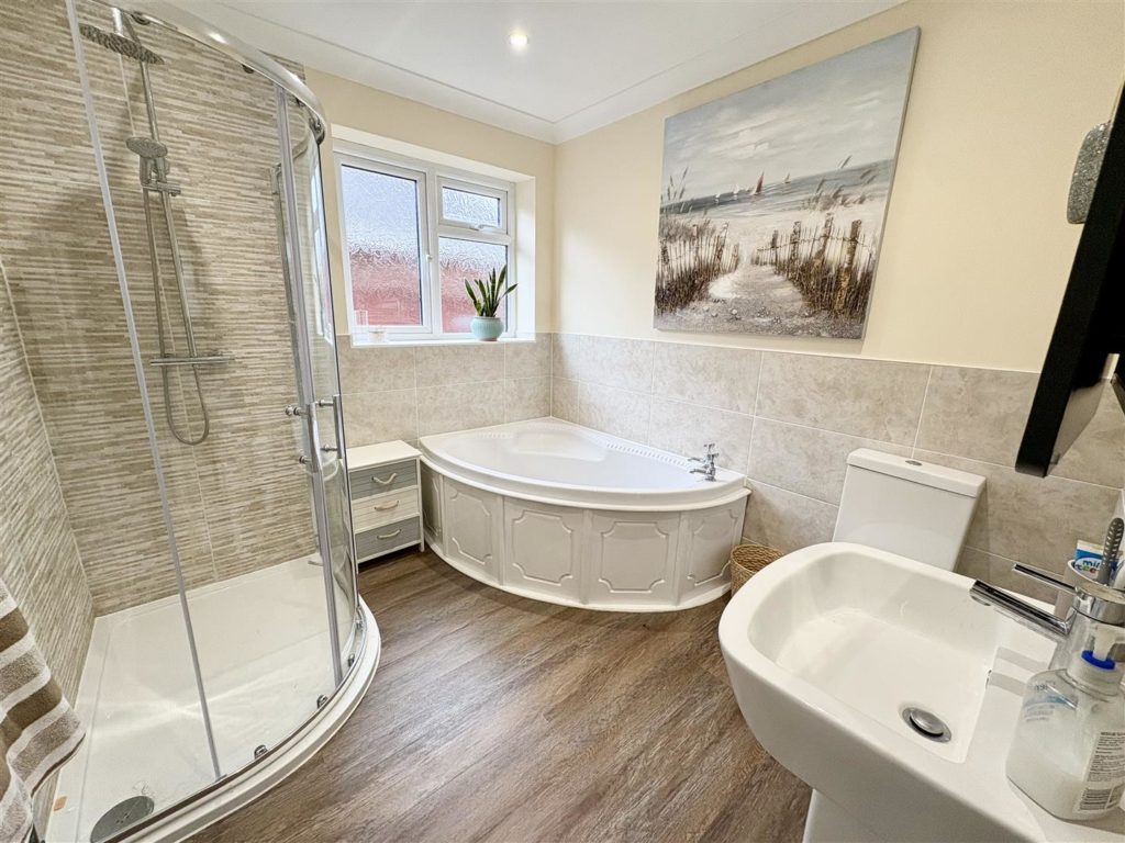 The large, fully tiled bathroom features a corner bath, a separate shower enclosure, WC, and a washbasin, complete with a wall mirror, light, shaver point, and extractor fan.