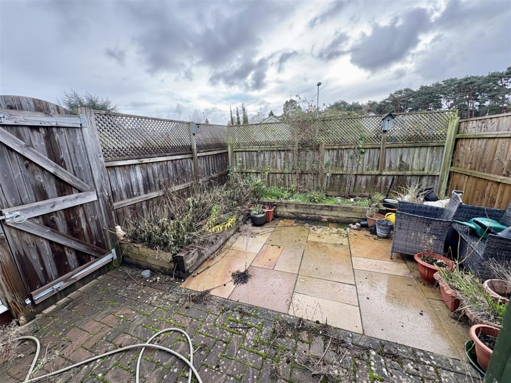 Outside, the garden offers a variety of enclosed areas, including a formal garden with lawn and borders, a courtyard, and a paved area adjacent to the garage and driveway.