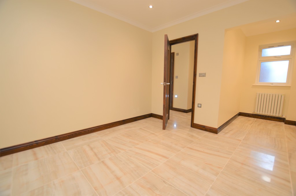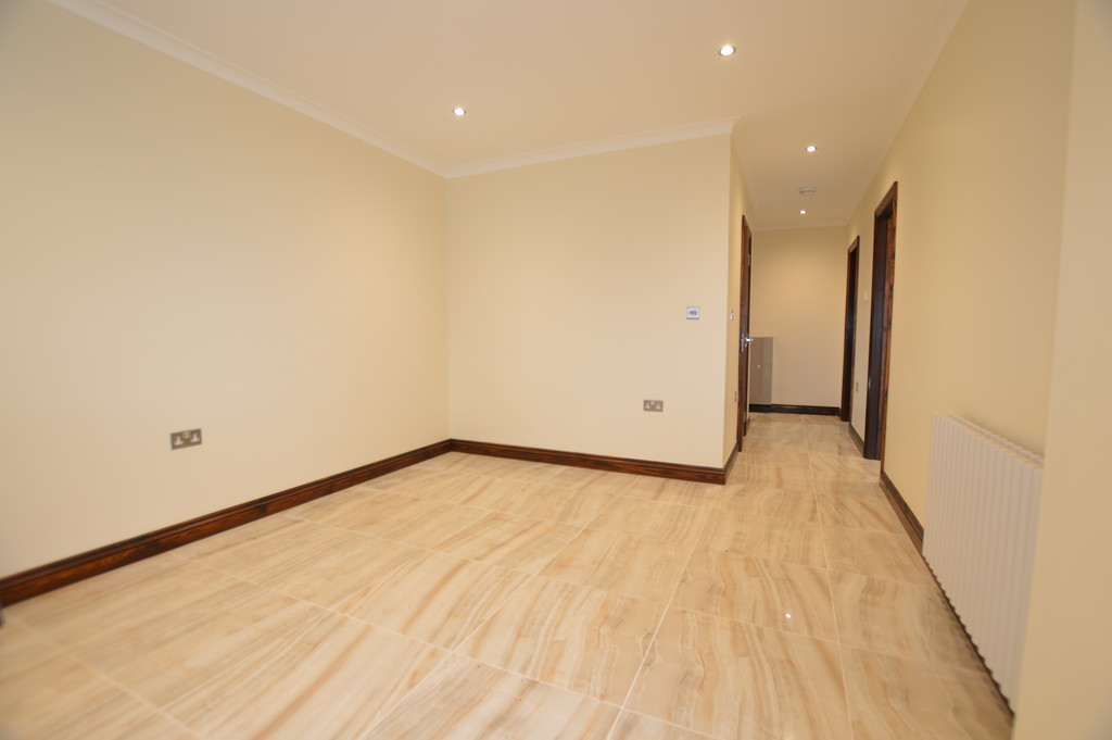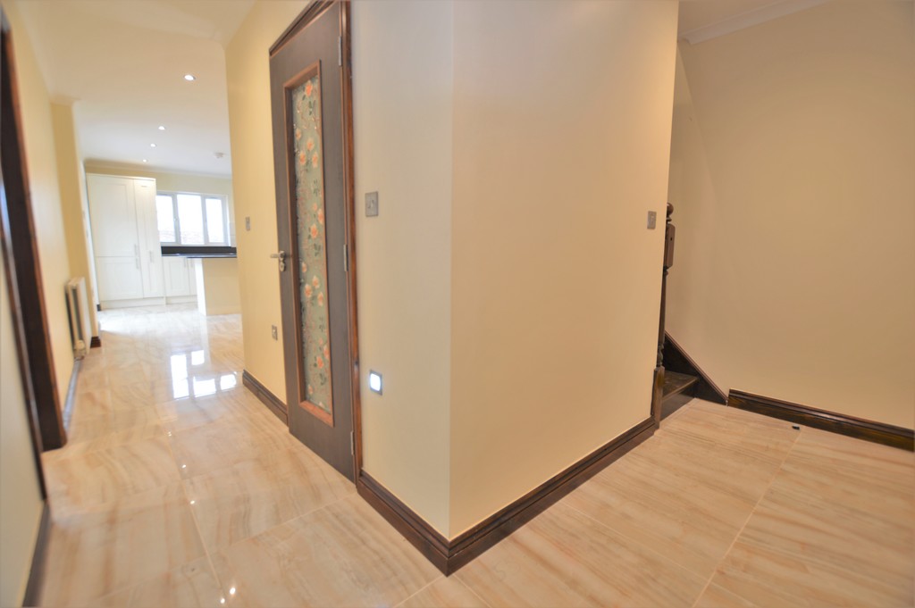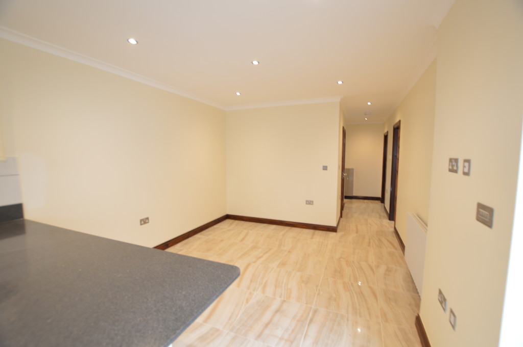 Directly in front of the front door is the stairs to the first floor, and the hallway giving access to bedroom two and the kitchen/living area. The modern and sleek kitchen benefits from full range of integrated appliances, Quartz stone work surfaces and a breakfast bar, as well as plenty of cupboard space.