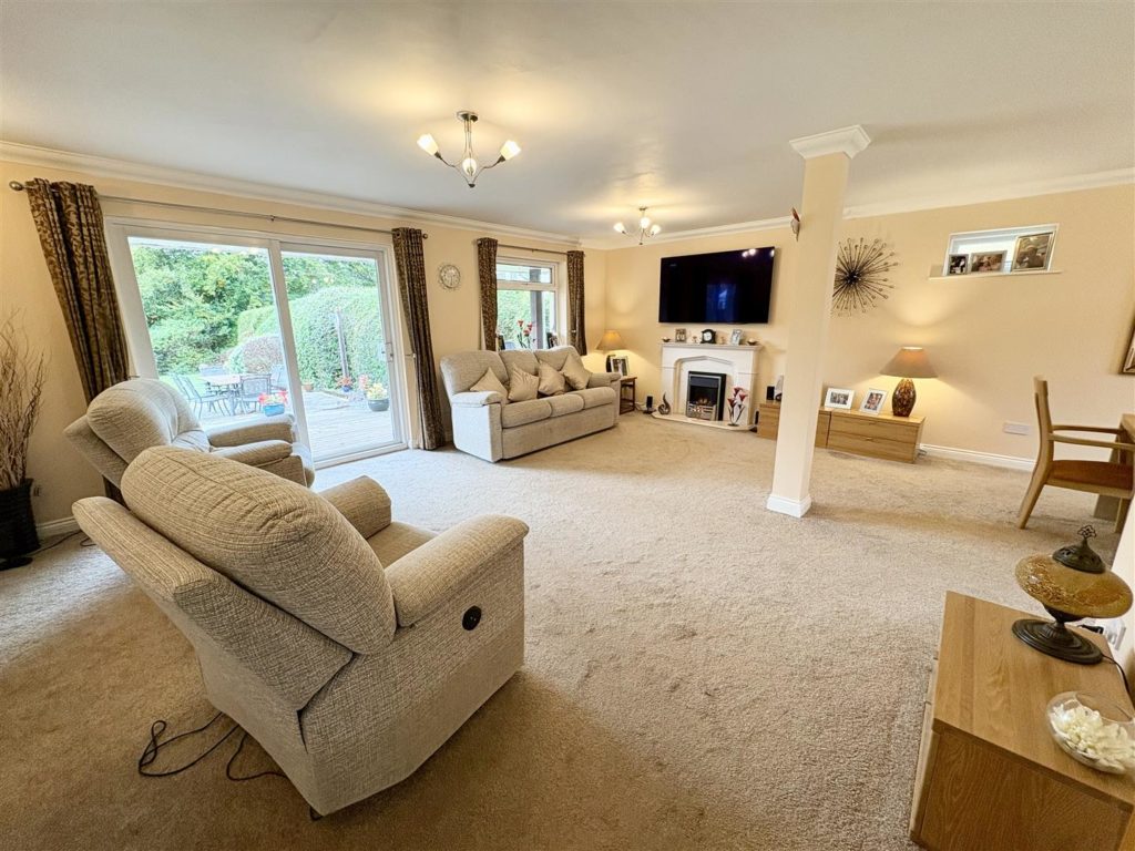 Upon entering, you are greeted by an attractive reception hall featuring a high vaulted ceiling and a tiled floor, creating a welcoming atmosphere. The double doors lead you into a generous L-shaped lounge/dining room, complete with a decorative limestone fireplace and a patio door that opens onto a raised sun deck, perfect for enjoying sunny afternoons. The dining area, which could easily be reinstated as a fifth bedroom, offers independent access, adding to the flexibility of the space.