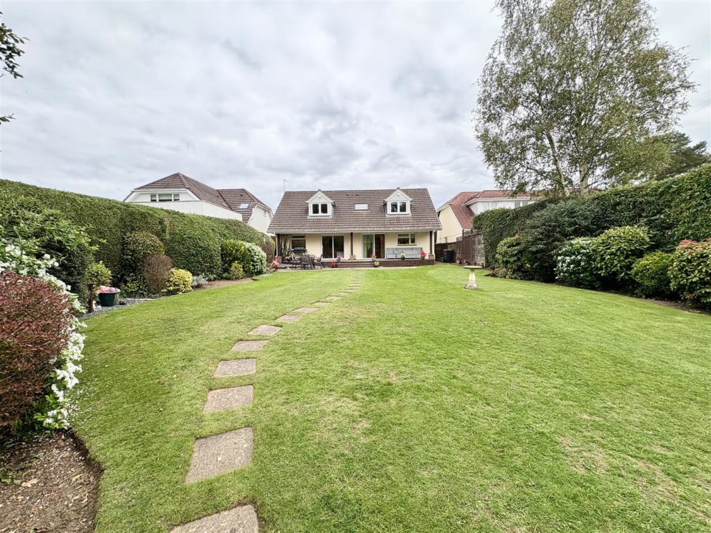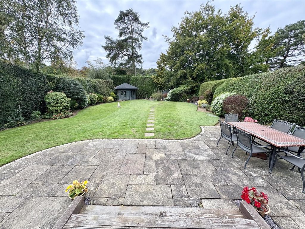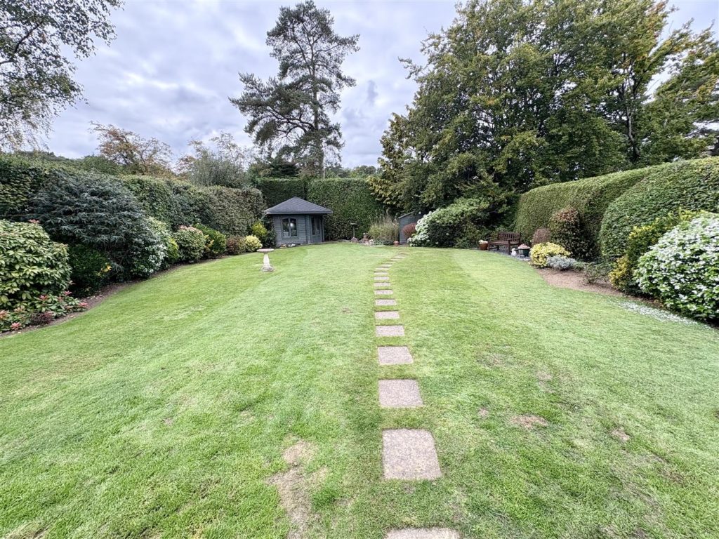 Outside, the property is complemented by ample off-road parking and a beautifully landscaped garden. The rear garden is a true oasis, featuring a covered seating area with recessed lighting, ideal for al fresco dining, as well as a large lawn, wide shrub beds, and a charming timber summerhouse.