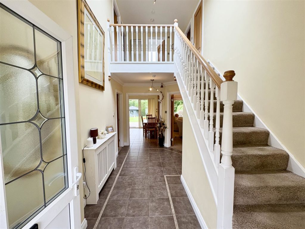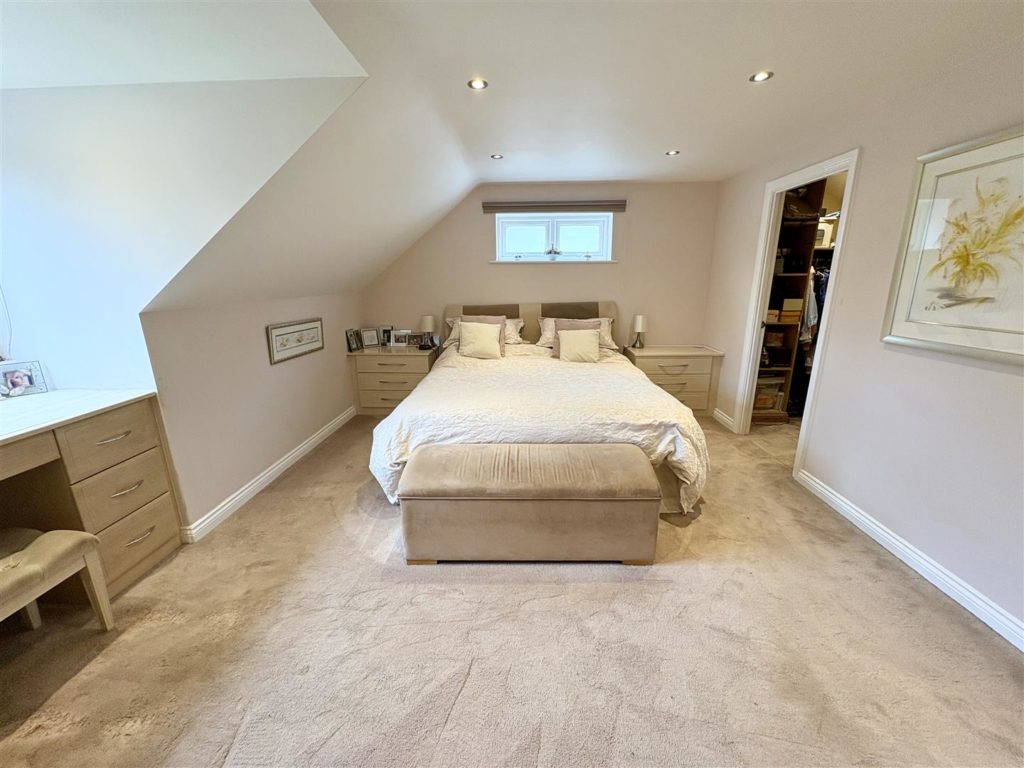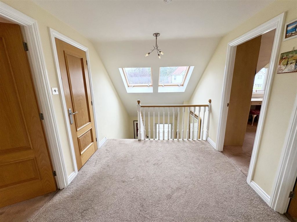 Ascending the stairs, you will find a spacious galleried landing that leads to three further good size double bedrooms, including a master suite with a walk-in wardrobe and en-suite shower room. The family bathroom is a luxurious retreat, featuring a jacuzzi bath and a skylight that fills the space with natural light.