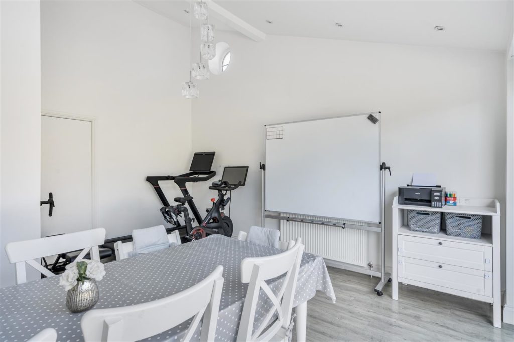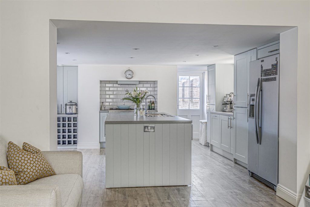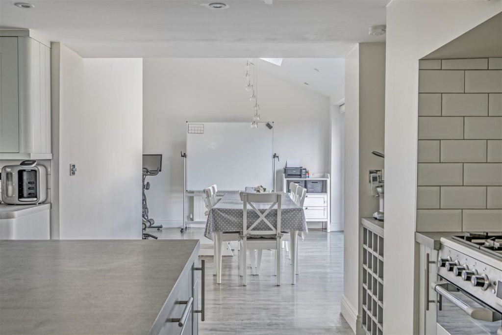 The stylish contemporary kitchen features a central island unit and extensive range of matching floor and wall units with integrated appliances including dishwasher, washing machine and integrated bins, along with a feature alcove and space for a range style cooker. Quality hard flooring is laid throughout and a fireplace with fitted inset gas fire provides a focal point in the living area. A notable feature in the dining area is a high vaulted ceiling with Velux windows ensuring plenty of natural light. Further ground floor accommodation includes a reception/sitting room and a cloakroom.