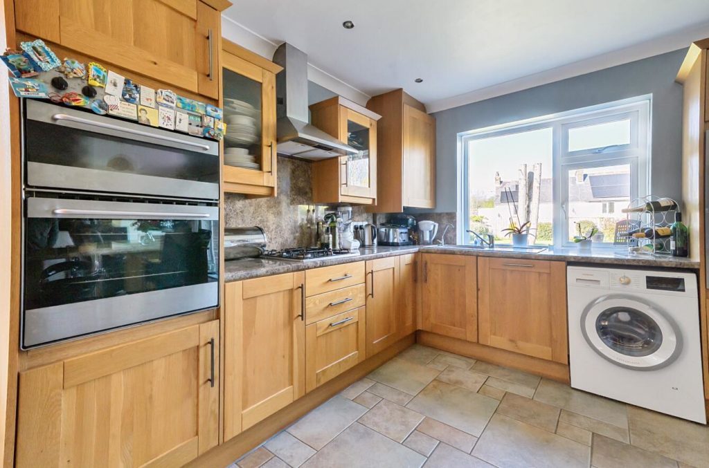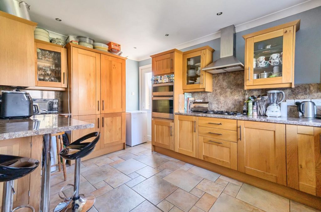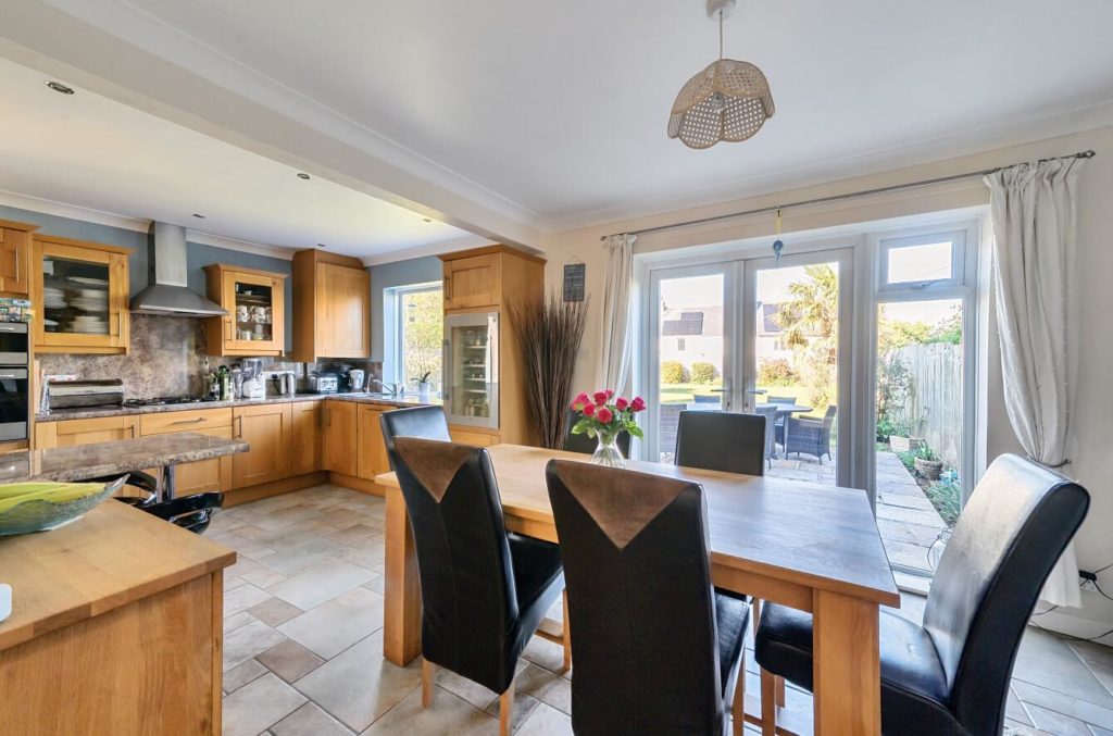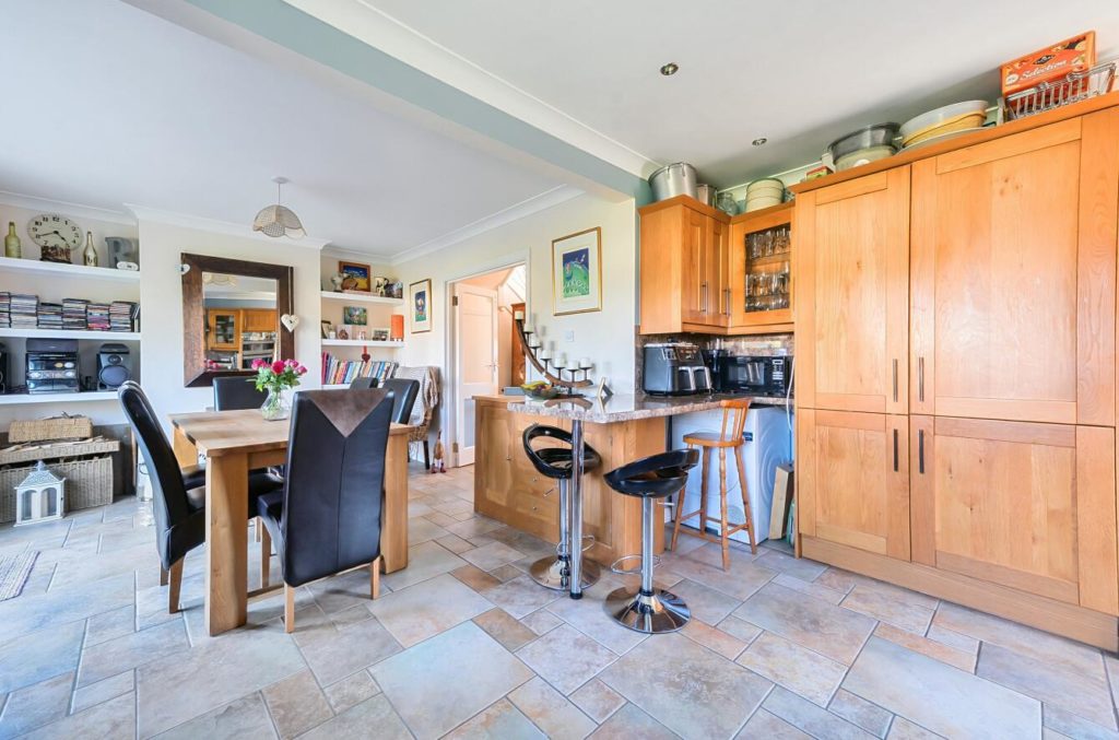 The kitchen/dining room is located at the rear of the property and has direct access to the large garden via patio doors. The kitchen itself includes a range of base and wall units and there is space for a large dining table.