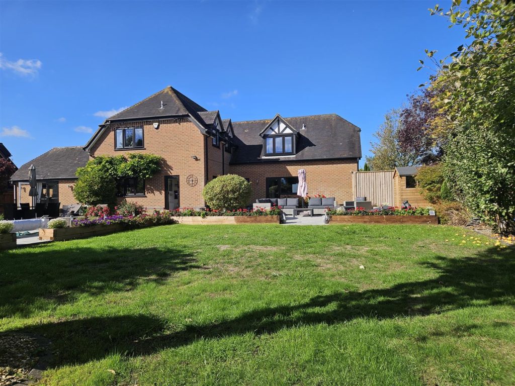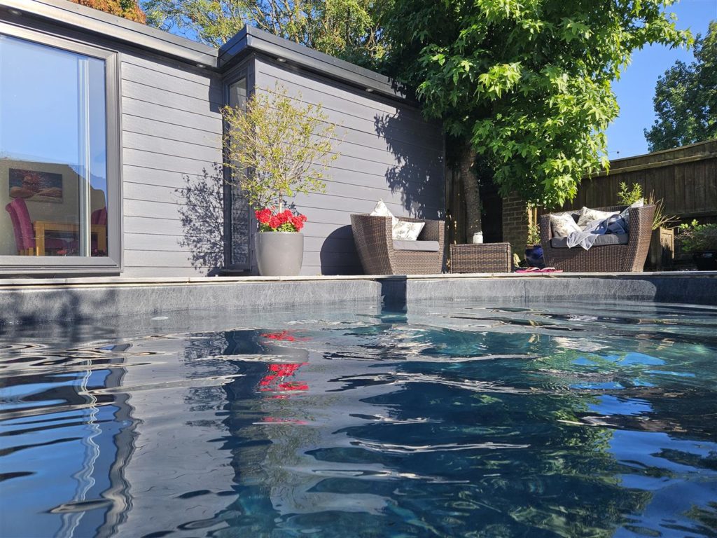 Outside, the rear garden is east south facing with the front and courtyard being westerly facing. Beautifully manicured, the gardens are a true oasis, featuring a newly laid patio that wraps around the rear of the property, perfect for alfresco dining. Two decking areas enhance the new patio areas with ample power and light externally in the garden and courtyard areas. A fantastic summerhouse/gym with sliding doors features built-in units and fridge alongside the newly refurbished, outdoor heated swimming pool comes complete with top of the range solar panel electric reel and new solar pool cover to maintain the temperature of the pool complementing the wonderful outdoor space – perfect for family gatherings. The property also benefits from a private driveway with newly installed solid wooden gates, providing ample parking and a lovely front garden with mature shrubs.