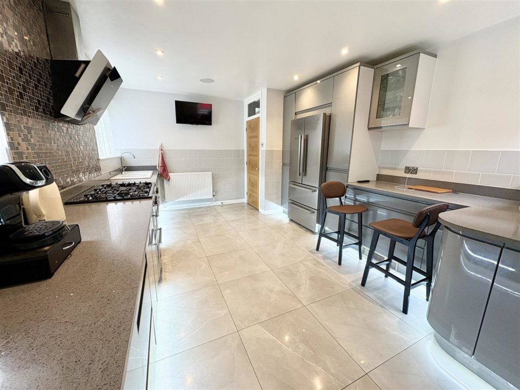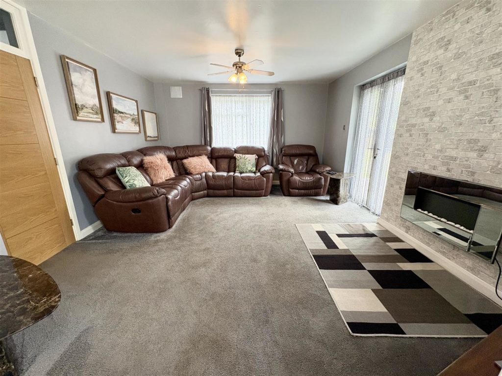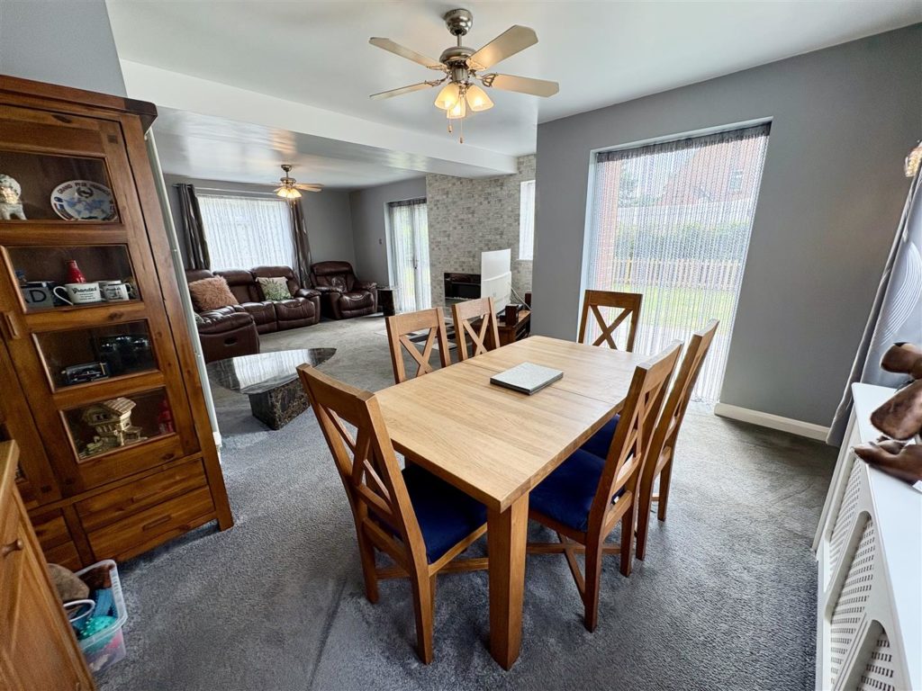 Stepping inside, the generous internal porch provides a welcoming entrance, with ample room for coat storage. The heart of the home is the beautifully fitted grey gloss kitchen, complete with stone worktops and a breakfast bar, which flows seamlessly into the lounge/dining room. This substantial triple-aspect room is bathed in natural light and features French doors that open onto a side patio, allowing for picturesque views of the garden.