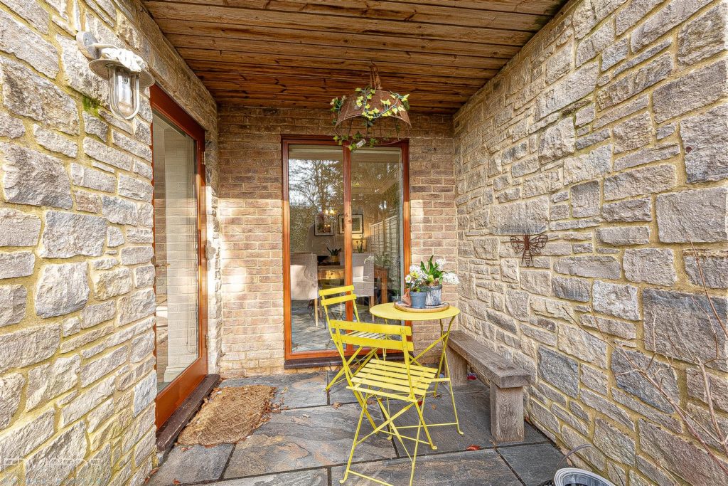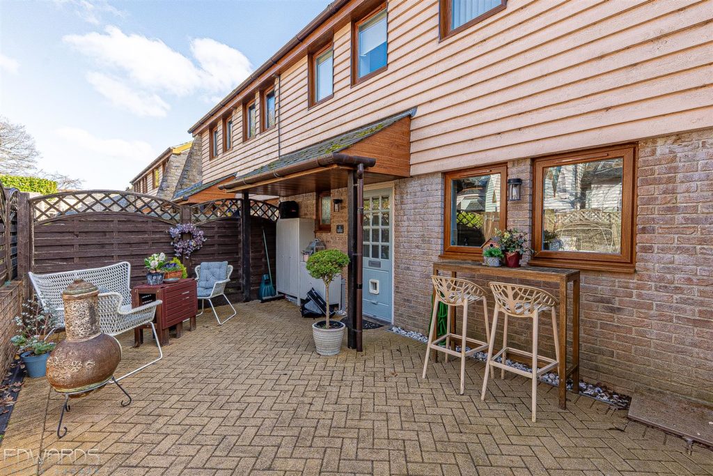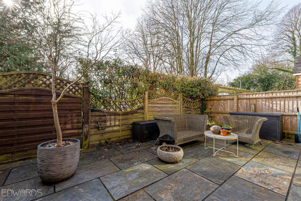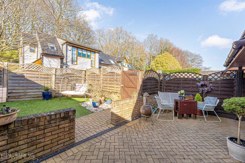 Outside, the gardens are a true highlight. The south-facing front garden features a superb sun terrace, enclosed by mature shrubs and hedging, while the rear garden offers a brick paviour patio ideal for alfresco dining, surrounded by artificial lawn and vibrant flower borders.