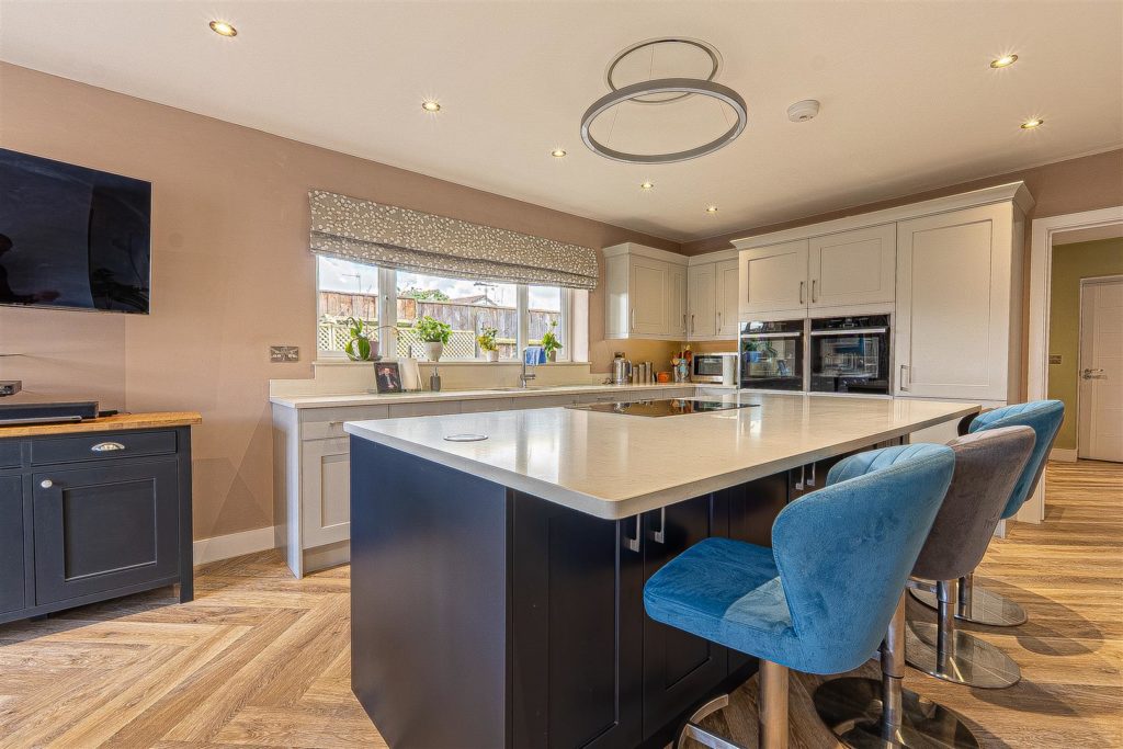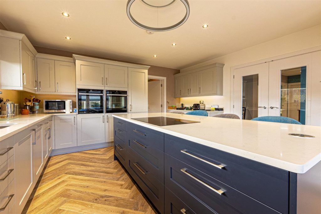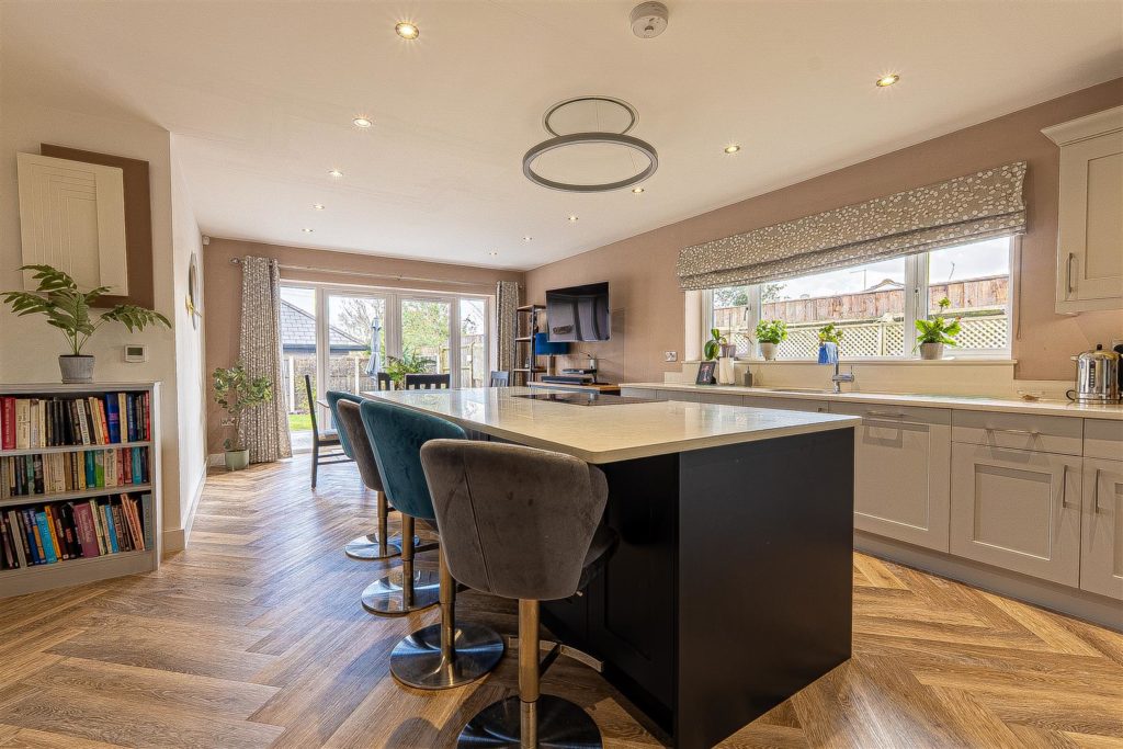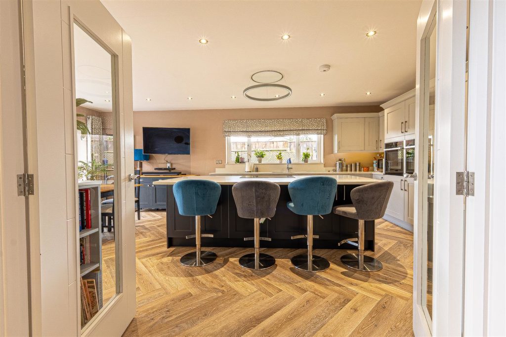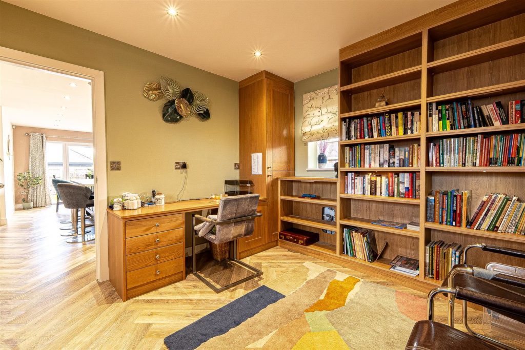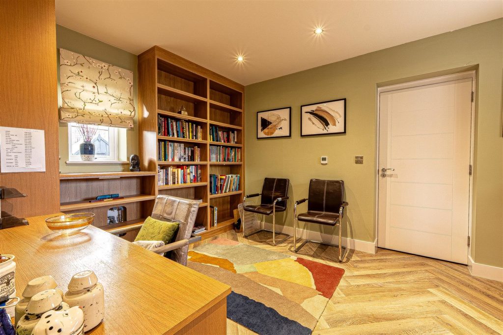 As you enter, you are greeted by a stunning semi vaulted living room with a beautiful view over the rear patio and garden. This exceptional dual aspect kitchen/diner is accessed via double internal doors and features stylish units, a centre island and stone worktops and splashback with integrated appliances, it also has access out to the rear patio and garden. This is complimented by a utility space at the rear of the garage accessed via the through office/study, fully fitted with office furniture and bookcases.