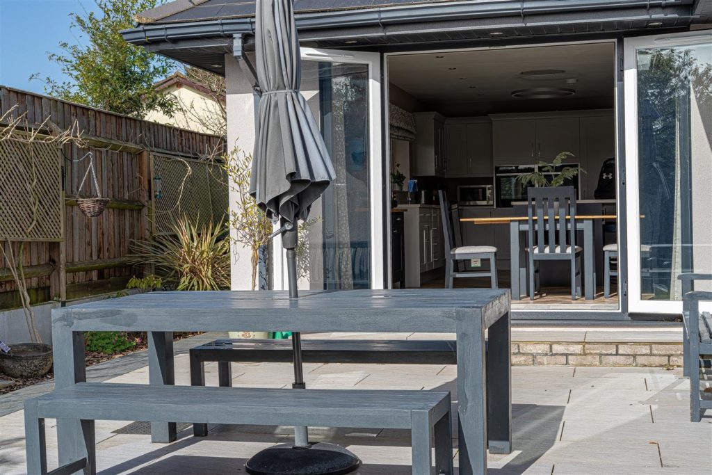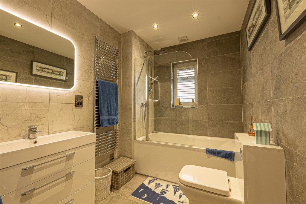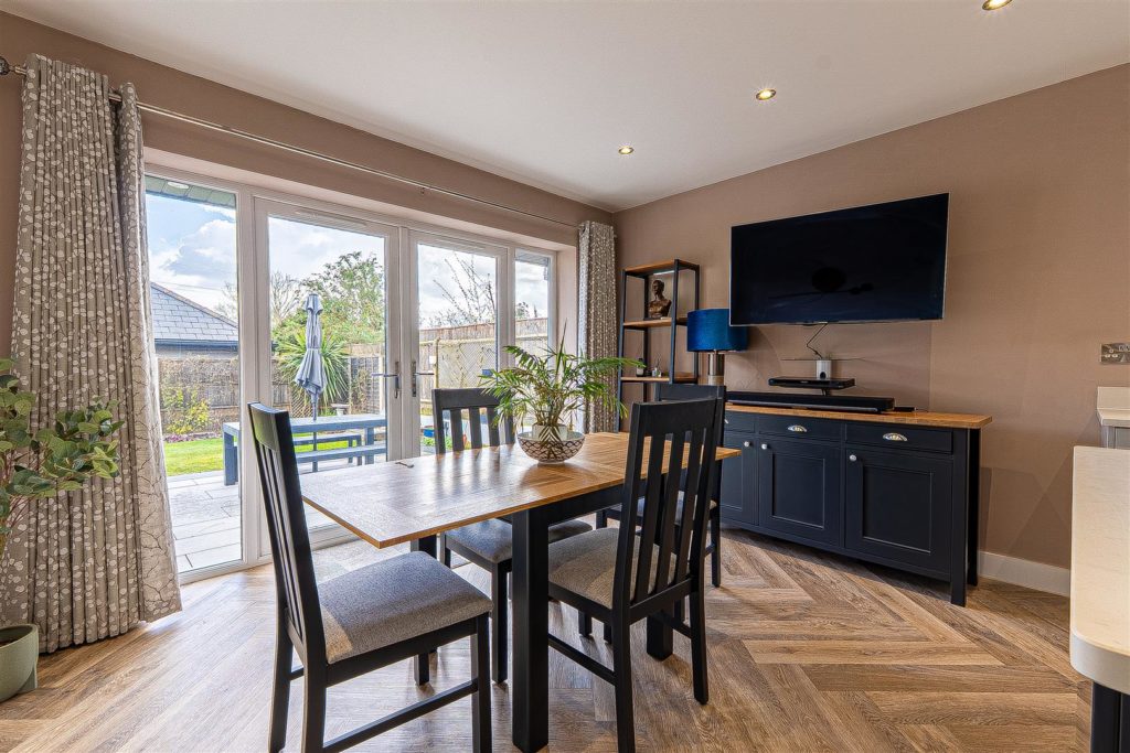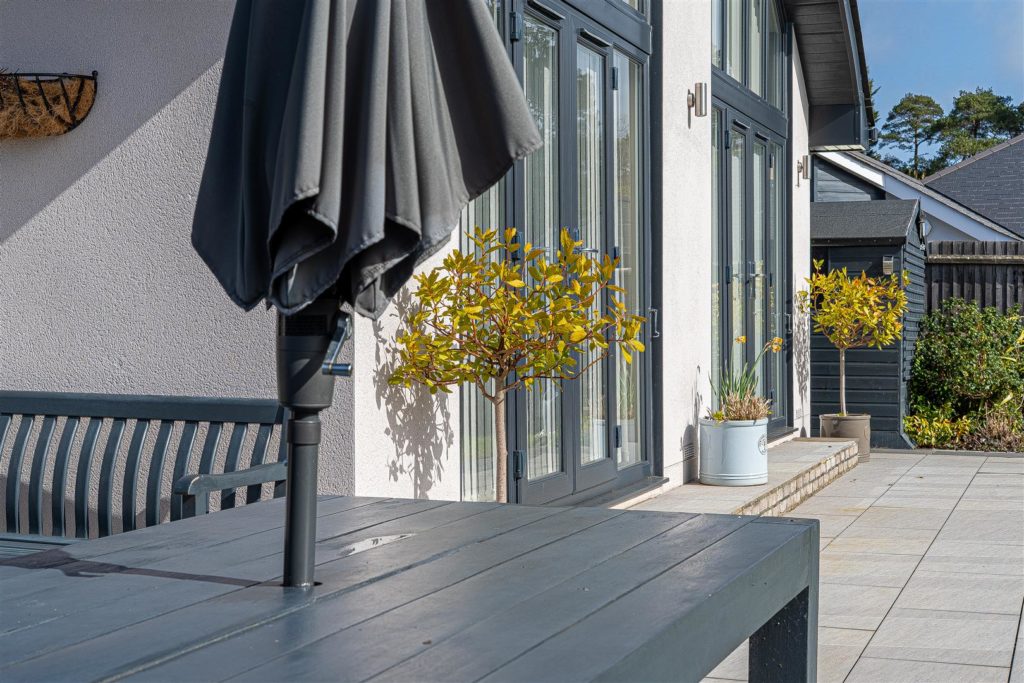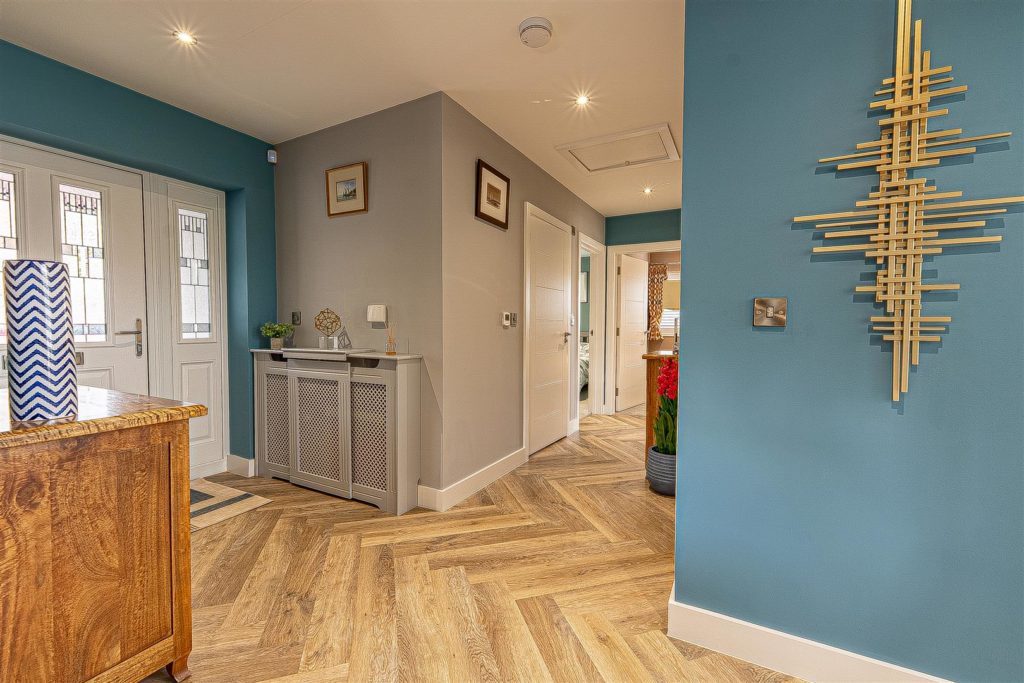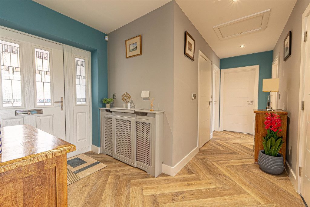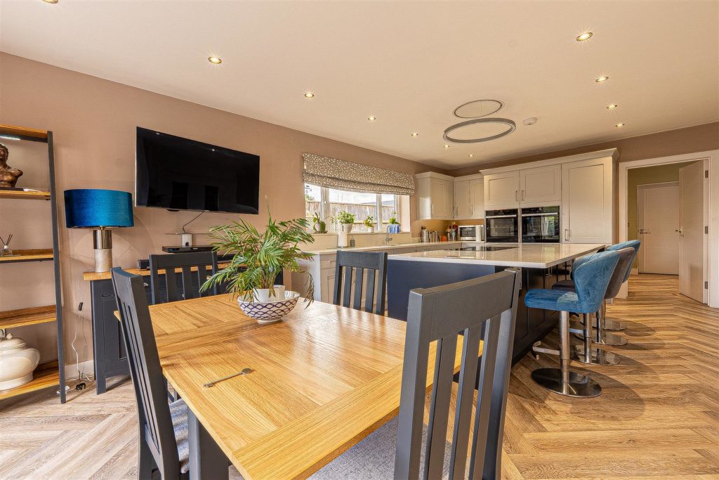 As you enter, you are greeted by a stunning semi vaulted living room with a beautiful view over the rear patio and garden. This exceptional dual aspect kitchen/diner is accessed via double internal doors and features stylish units, a centre island and stone worktops and splashback with integrated appliances, it also has access out to the rear patio and garden. This is complimented by a utility space at the rear of the garage accessed via the through office/study, fully fitted with office furniture and bookcases.