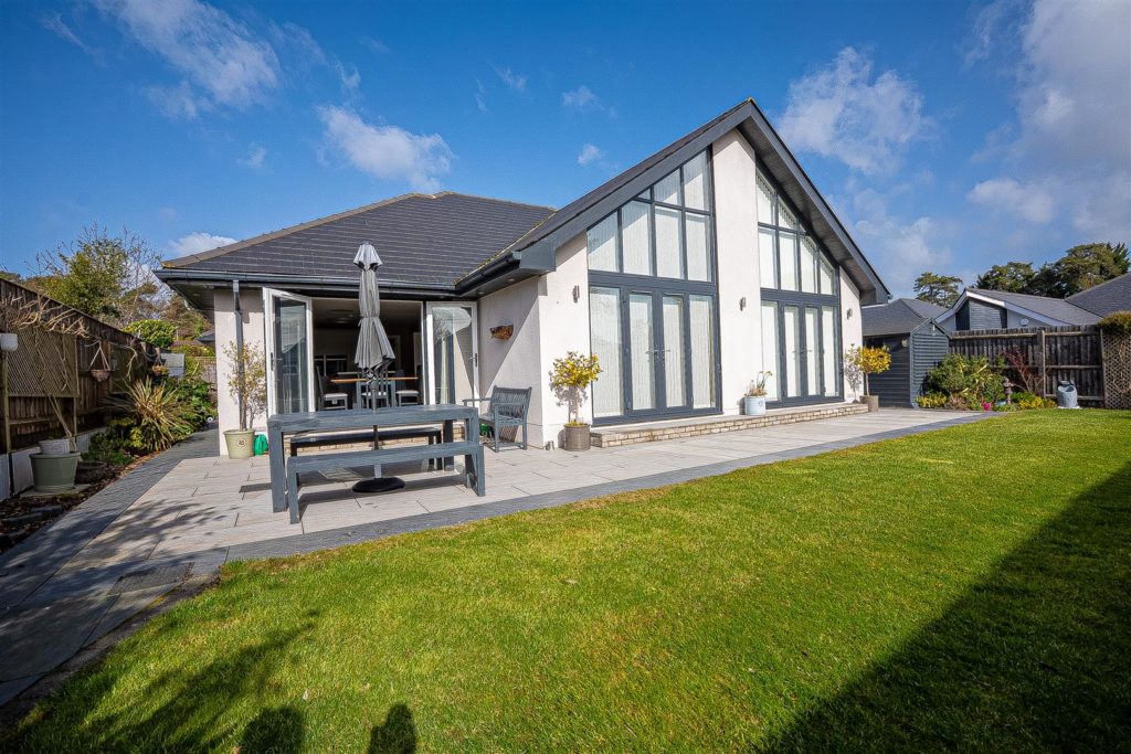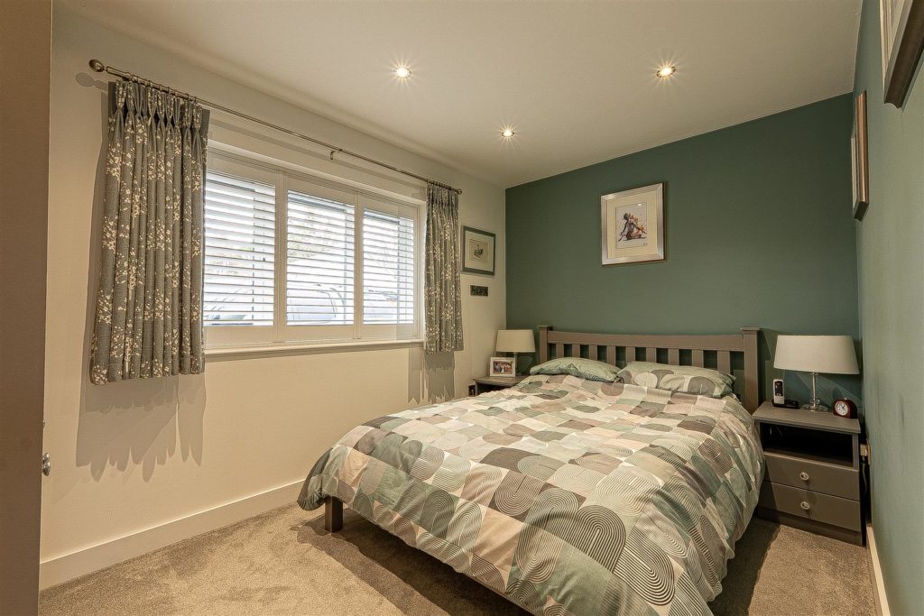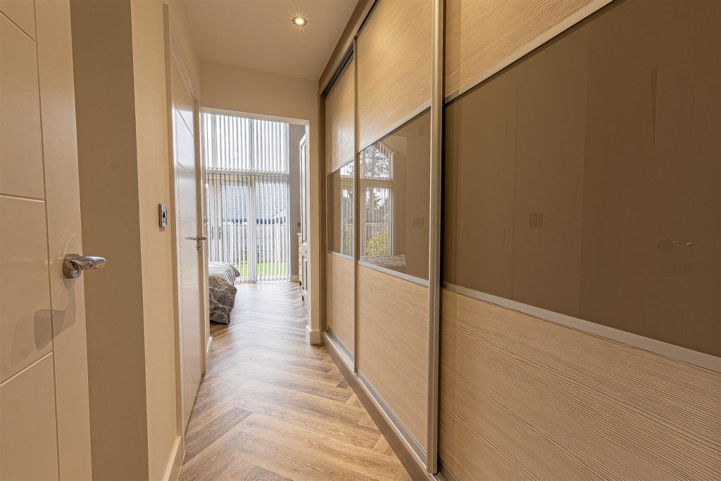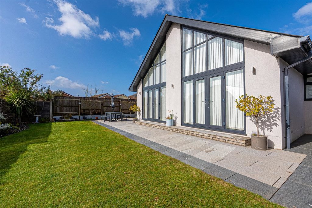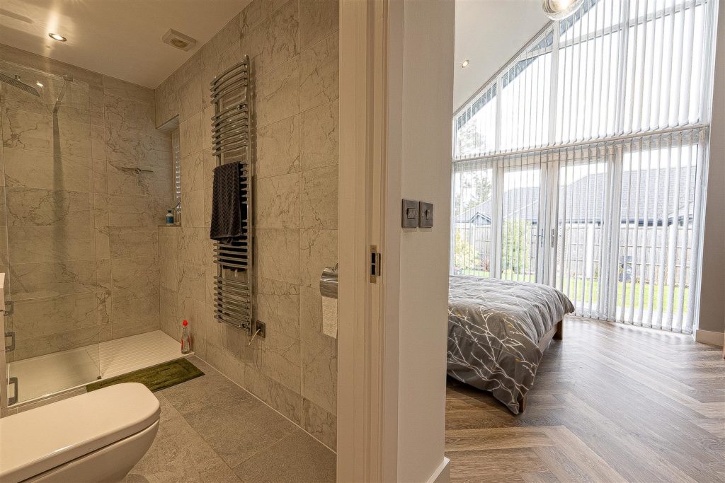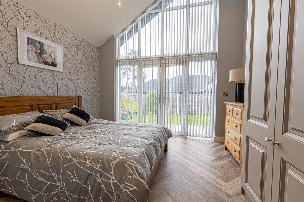 The bungalow boasts two well appointed bathrooms and separate cloakroom providing ample convenience for family and guests. The interior is finished to an exceptional standard showcasing modern comforts such as underfloor heating throughout, vaulted ceilings in both the master bedroom and lounge, ensuring a warm and inviting atmosphere all year round. The master bedroom features a spacious dressing room plus access to the rear patio and garden, adding a touch of luxury to the master suite.
