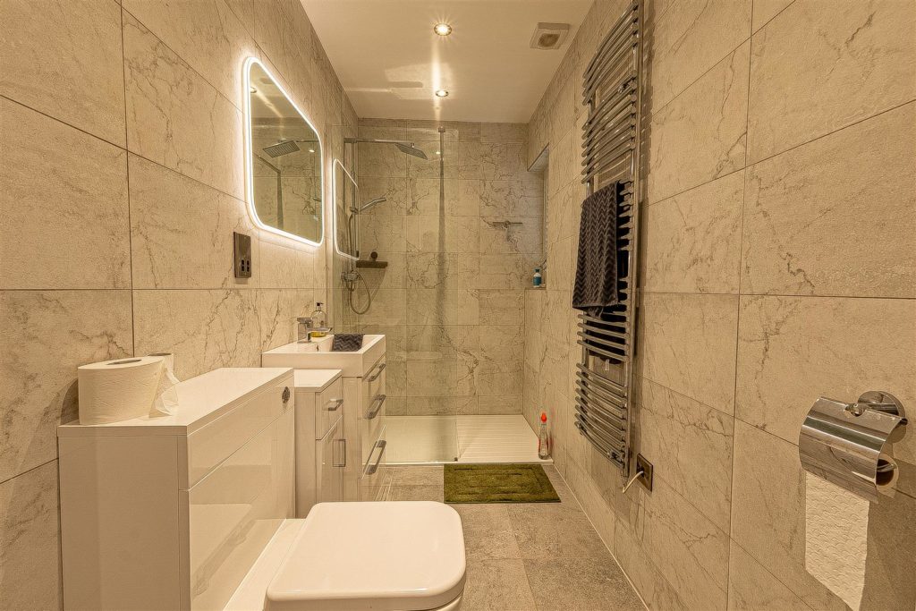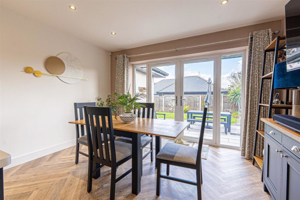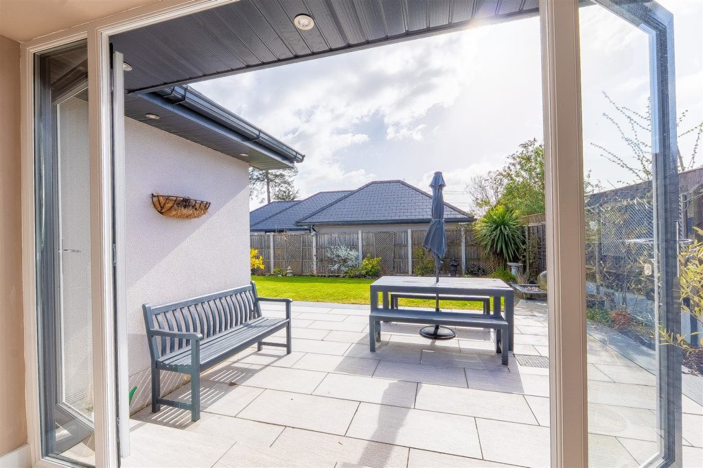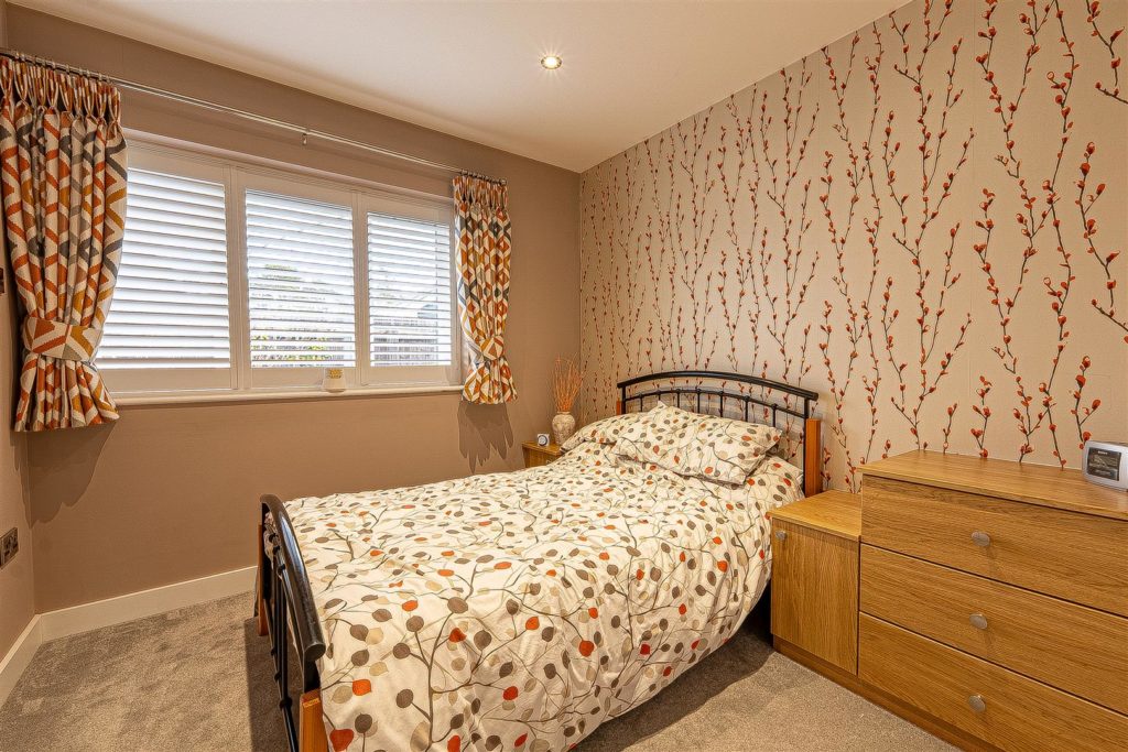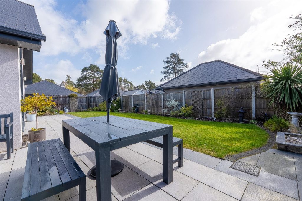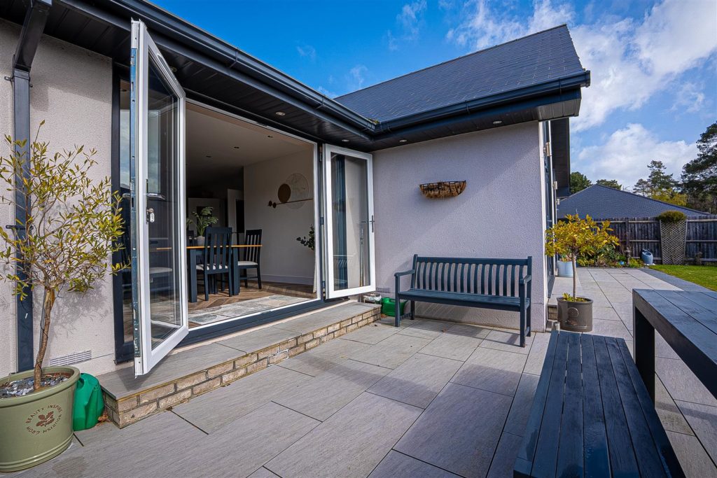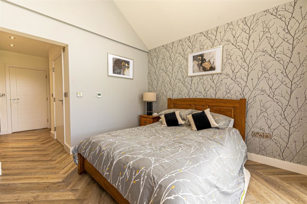 The bungalow boasts two well appointed bathrooms and separate cloakroom providing ample convenience for family and guests. The interior is finished to an exceptional standard showcasing modern comforts such as underfloor heating throughout, vaulted ceilings in both the master bedroom and lounge, ensuring a warm and inviting atmosphere all year round. The master bedroom features a spacious dressing room plus access to the rear patio and garden, adding a touch of luxury to the master suite.